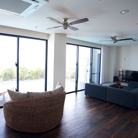 side.Aの客室は全て2階となっており、大きな窓からは目の前に広がる海と庭が望めます。客室部面積は各部屋約30m2(ベランダ部含む)とゆったりとした造り。内装は自然素材にこだわり、床には無垢アンティーク調フローリングに壁は琉球漆喰。大きな窓から臨む海と安心の自然素材で構成されたインテリアで落ち着いた休日をお過ごしいただけることをお約束しますまた屋上にはジャグジーが設置されており、side.Aご宿泊者のお客様には各組1時間づつ貸切でご利用いただけます。『夕空を眺めながら』『満点の星空を眺めながら』、あなただけの『そら』を見つけてください。