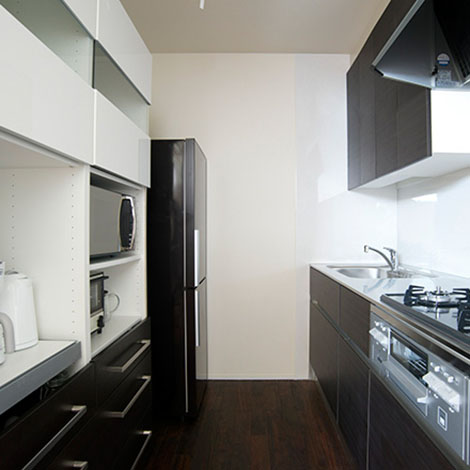 本格的なシステムガスキッチンと大型冷蔵庫、レンジ、炊飯器など充分なキッチン設備が整っており、長期滞在にも不自由することがありません。