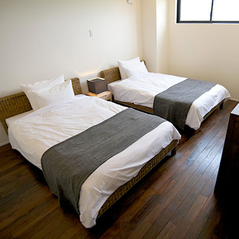 寝室はダブルベッドルームとツインベッドルームの2部屋。大人4名様(エキストラベッド使用で5名様まで)のご宿泊が可能です。木調の落ち着きのあるインテリアと某一流ホテルでも使われているsertaのマットレスで快適な睡眠をお約束致します。