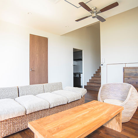 約15畳ほどのリビングから緑豊かな庭をのぞむことができます。ウォールナットの床材に、アジアンリゾートのセンスの良い家具に囲まれ、ゆっくりとした時間をお過ごしいただけます。